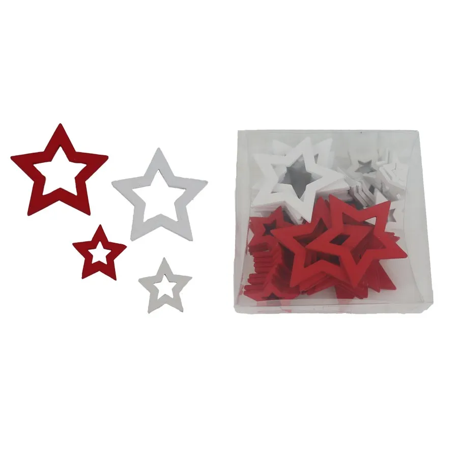 Set dekorativer Sterne. Das Set enthält 48 Sterne. Abmessungen: Kombination rot, weiß. Holzbasismaterial.