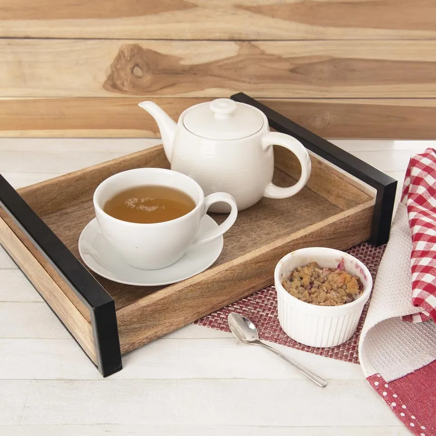 Holztablett mit Metallgriffen.