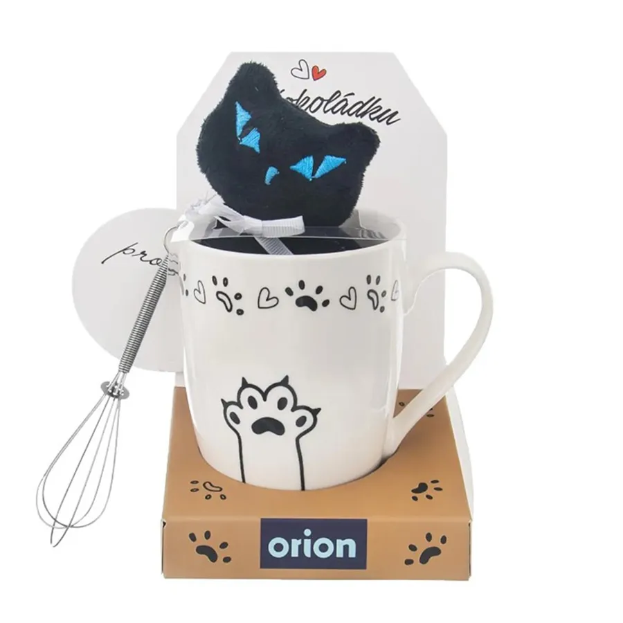 Der Becher ist als Geschenk verpackt und wird mit einem Schneebesen und einem Plüschtier geliefert.