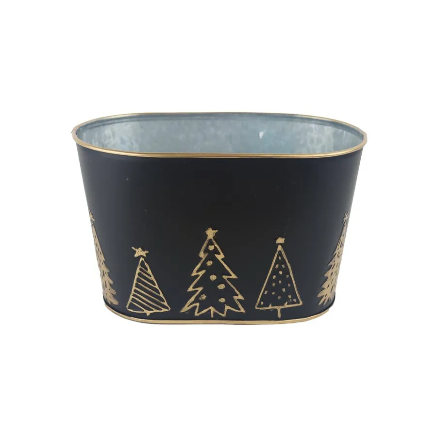 Ovaler Weihnachts-Zier-topf. Abmessungen : 19,5 x 11,5 cm, Höhe 12 cm. Farbe : Kombination aus Schwarz und Gold. Material : Metall.