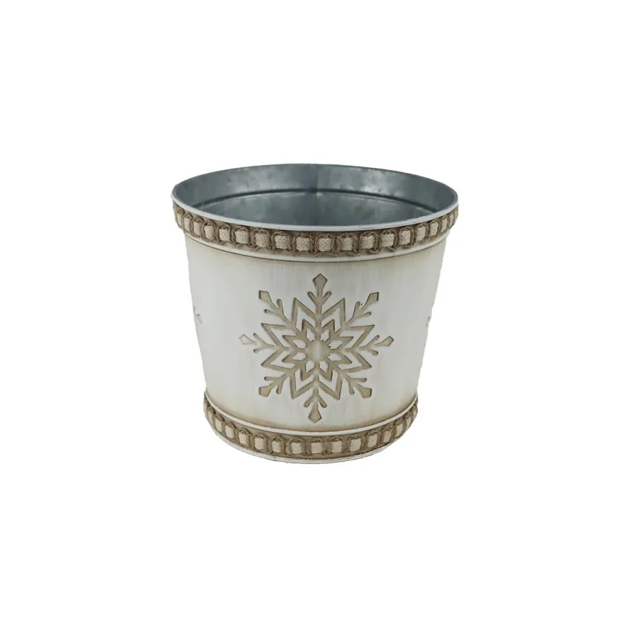 Ziertopf aus Blech mit Schneeflocke. Abmessungen : Durchmesser 15 cm, Höhe 13 cm. Farbe : Kombination aus Creme und Braun. Material : Metall.