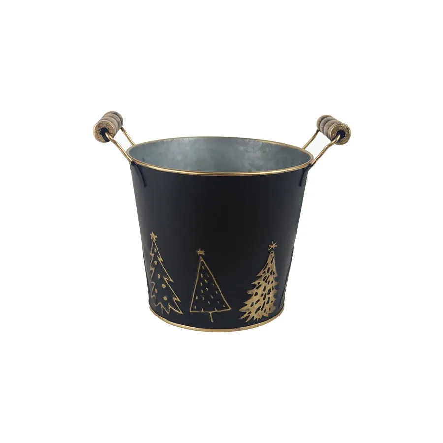 Weihnachtlicher Ziertopf. Abmessungen : Durchmesser 15 cm, Höhe 13 cm. Farbe : Kombination aus Schwarz und Gold. Material : Metall.