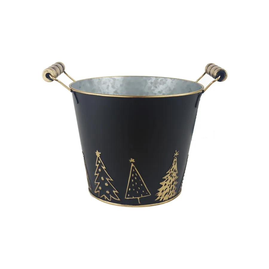 Weihnachtlicher Ziertopf. Abmessungen : Durchmesser 17 cm, Höhe 14 cm. Farbe : Kombination aus Schwarz und Gold. Material : Metall.