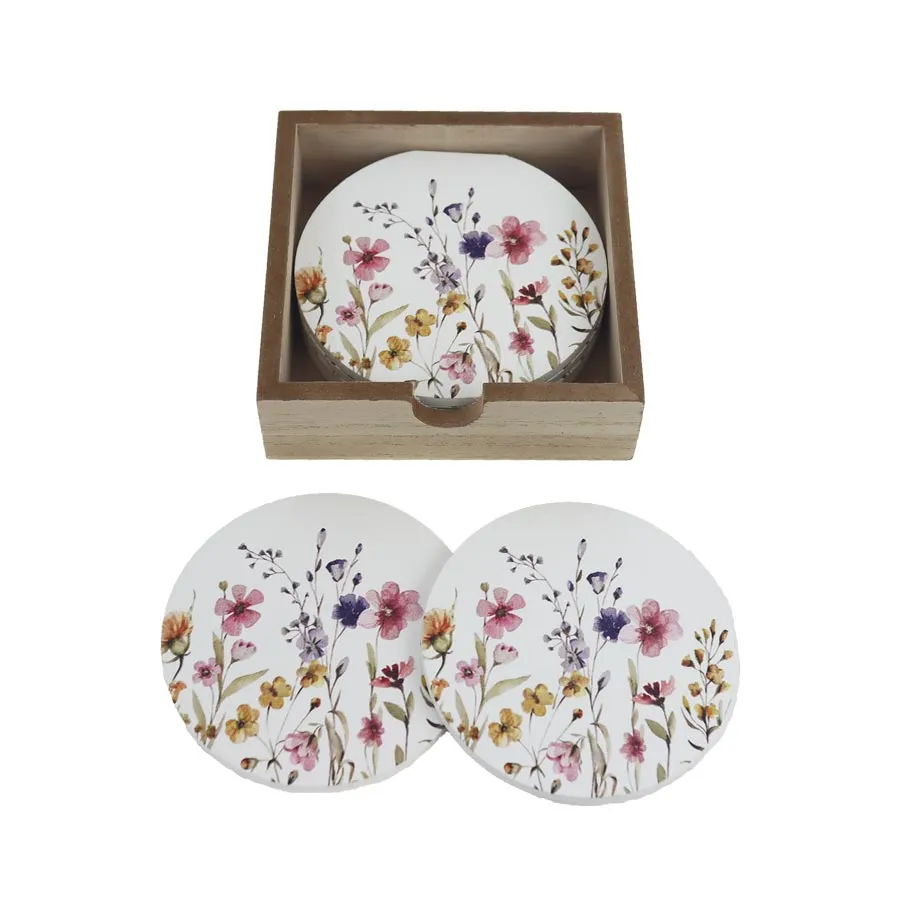 Ein Satz Untersetzer aus Holz. Das Set enthält 5 Untersetzer.