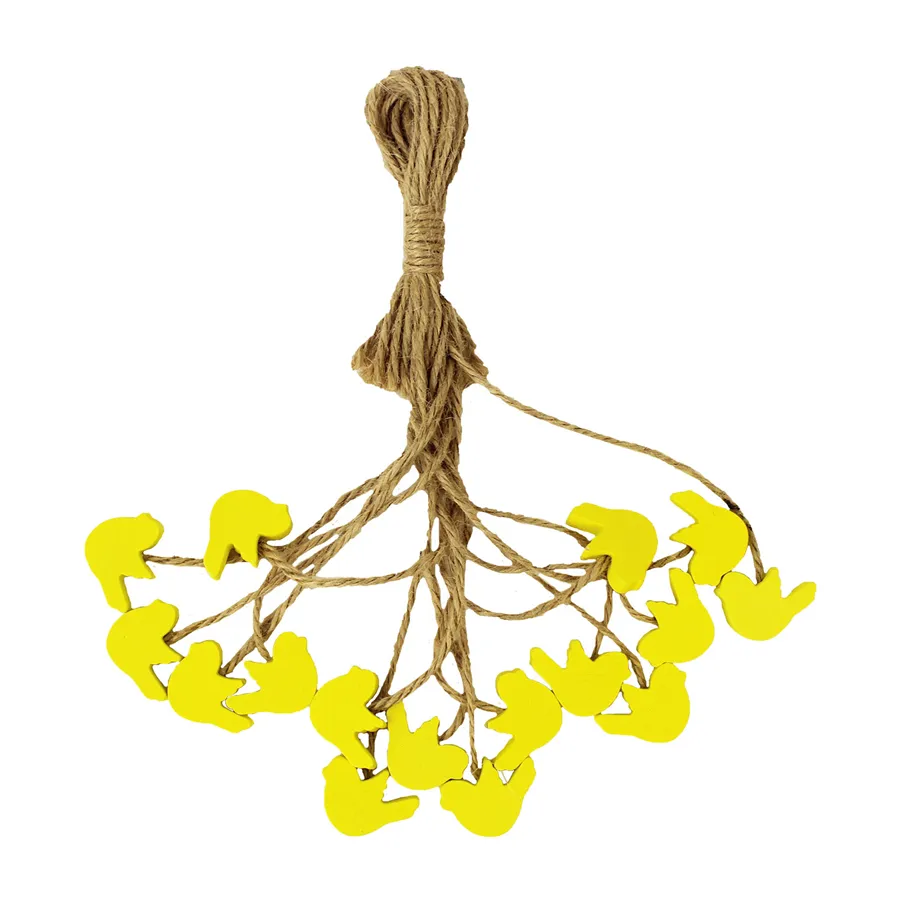 Dekovögel im Bündel. Das Paket enthält 16 Vögel. Maße: 3 x 3 cm, Gesamtlänge mit Schnur 20 cm. Gelbe Farbe. Material: Holz.