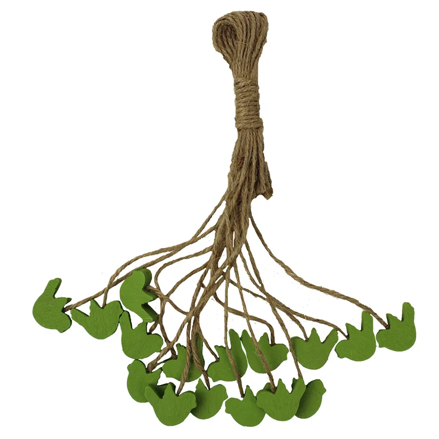 Dekovögel im Bündel. Das Paket enthält 16 Vögel. Maße: 3 x 3 cm, Gesamtlänge mit Schnur 20 cm. Farbe grün. Material: Holz.