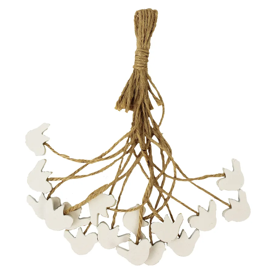 Dekovögel im Bündel. Das Paket enthält 16 Vögel. Maße: 3 x 3 cm, Gesamtlänge mit Schnur 20 cm. Weiße Farbe. Material: Holz.