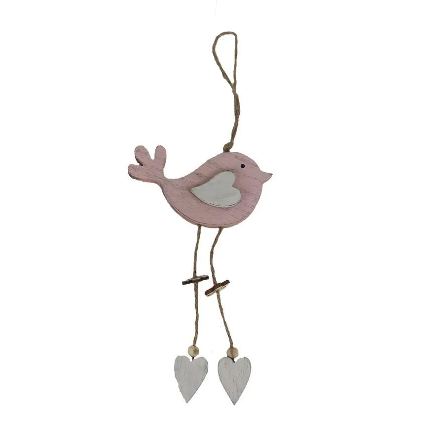 Deko-Vogel zum Aufhängen. Maße: 10,5 x 2 cm, Höhe 18 cm. Farbe: eine Kombination aus Rosa und Weiß, Holzwerkstoff, Juteschnur.