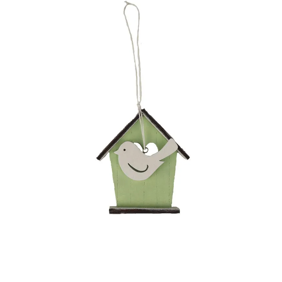 Dekorativer Stand zum Aufhängen. Maße: 8,5 x 1,8 cm, Höhe 9 cm, Gesamtlänge 17 cm. Farbe: Kombination Grün, Weiß, Natur. Material auf Holzbasis.