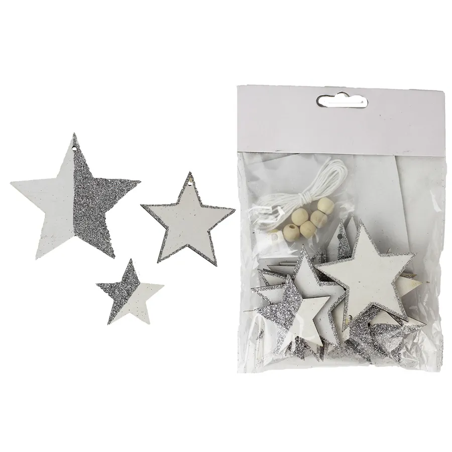 Set enthält 12 St. Sterne gibt es in 3 Größen. Set enthält Schnur und Perlen. Farbe: Kombination Weiß und Silber Material: Alternative zu Holz