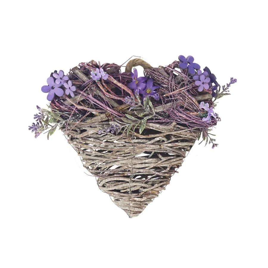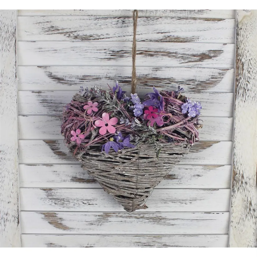 Dekoration - Herz. Farbe: grau mit violetten Blüten. Material: Weiden, Dekorationen.