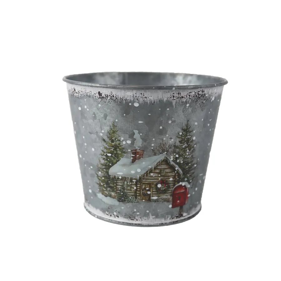 Blumentopf aus Blech mit Weihnachtsmotiv.