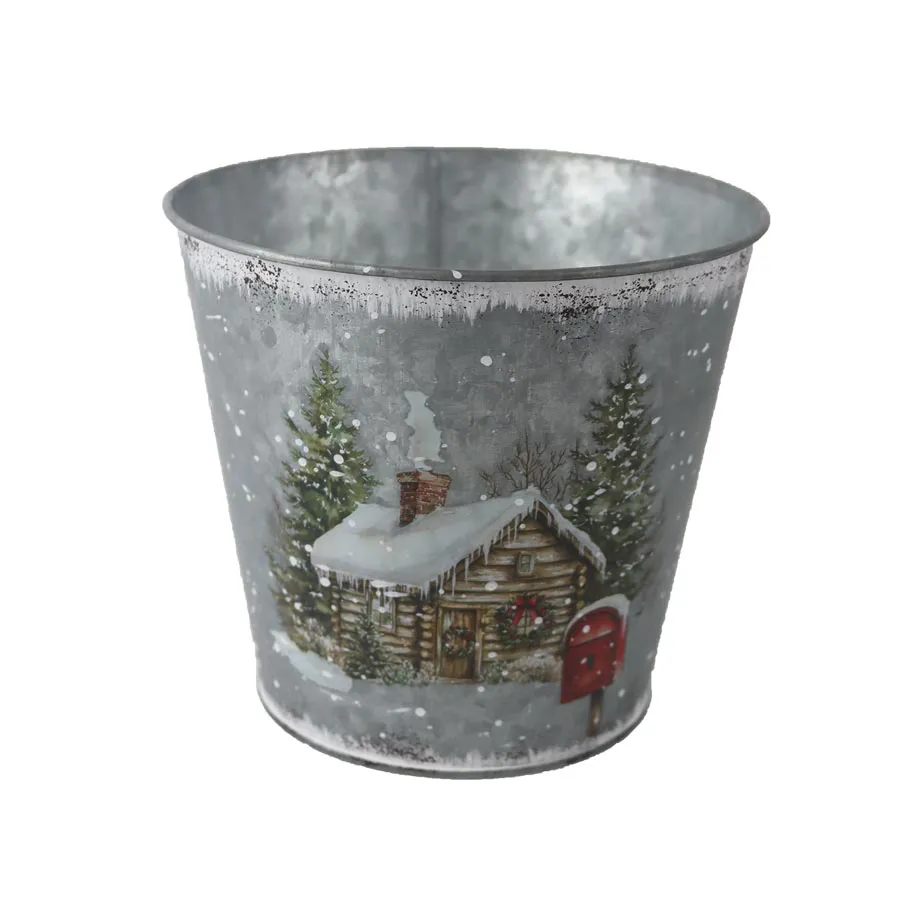 Blumentopf aus Blech mit Weihnachtsmotiv.