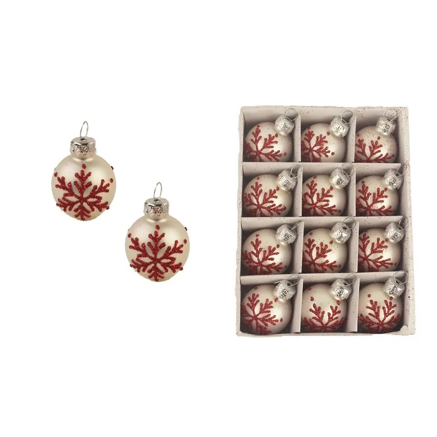 Weihnachtsdekoration zum Aufhängen.Das Set enthält 12 Ornamente.Maße: Durchmesser 3 cm, Höhe 3,5 cm.Farbe: Kombination aus Weiß und Rot.Material: Glas.