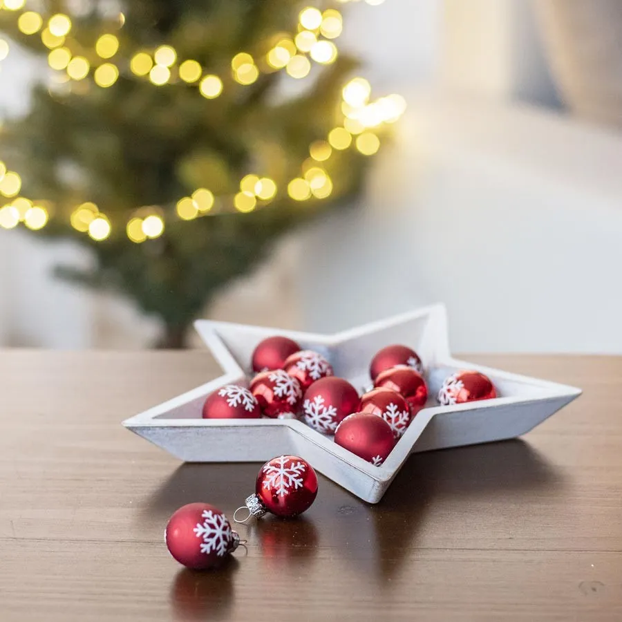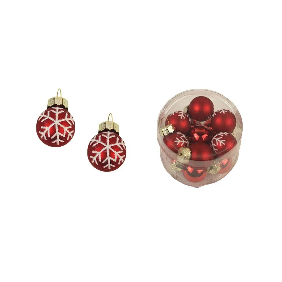Weihnachtsdekoration zum Aufhängen.Das Set enthält 12 Ornamente.Maße: Durchmesser 2 cm, Höhe 2,5 cm.Farbe: eine Kombination aus Rot und Weiß.Material: Glas.