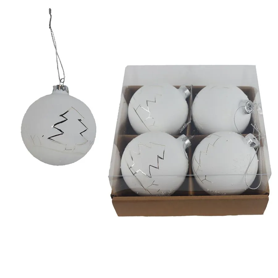 Set mit Weihnachtsschmuck. Das Set enthält 4 Ornamente. Abmessungen : Durchmesser 8 cm, Höhe 9 cm. Farbe : weiß. Material : Glas.